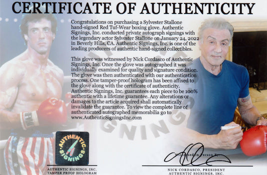 Sylvester Stallone Autographed ROCKY IV Red Tuf Wear Boxing Glove