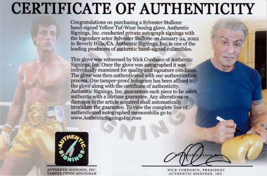 Sylvester Stallone Autographed ROCKY III Yellow Tuf Wear Boxing Glove